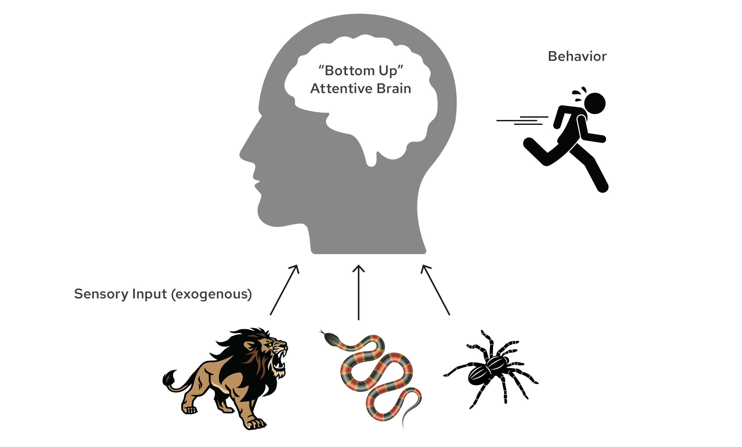 Also known as “stimulus-driven” attention, bottom-up refers to the way you attend to your environment in response to external, sensory observations. This form of attention is an evolutionary adaptation, being a key aspect of human survival long ago. It helped people avoid danger and toxins by responding appropriately to sensed threats.