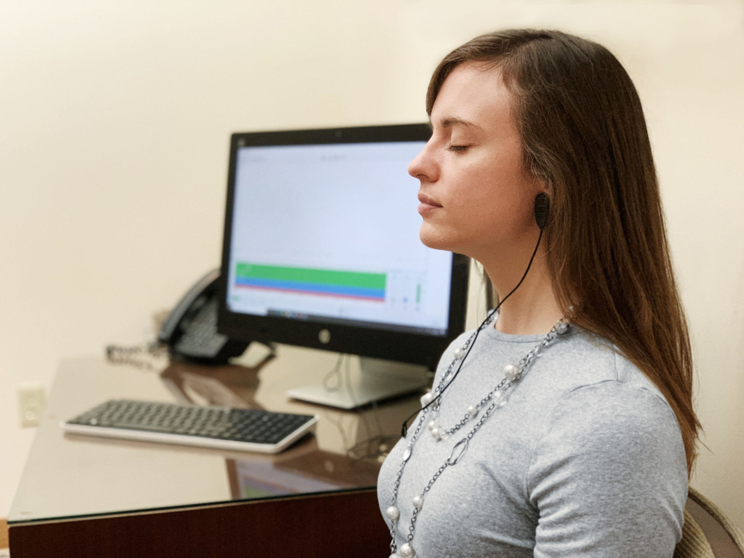 One specific breathing technique used widely at PALM Health is targeted particularly towards bringing you into a state of cardiac coherence. To start this technique, sit quietly in a comfortable position and close your eyes. Relax all of your muscles from the bottom up, starting with your feet and progressing up to your face. Then, you’ll begin breathing.