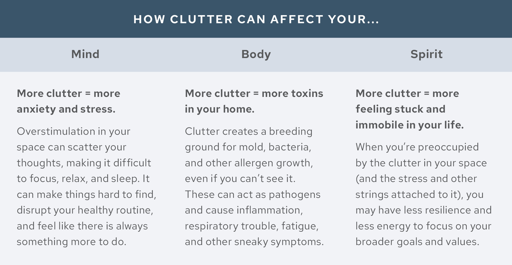 According to Julie Geeting, licensed therapist and well-being coach, “Getting curious about what’s behind the disorganization in your space and making an effort to change that can lead to a greater understanding of your mind, body, and spirit.”
